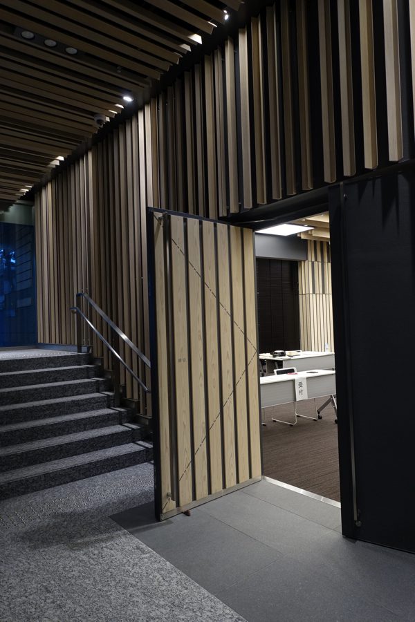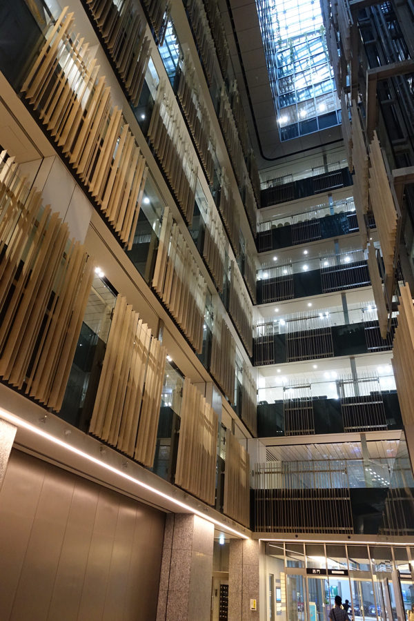 内部の吹抜けも圧巻で、L型の縦ルーバーがとっても印象的。
